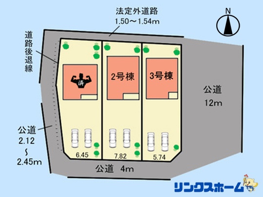 | 接道状況 | 東側12m公道 西側2.12~2.45m公道 南側4m公道 北側1.50~1.54m認定外道路 | ||